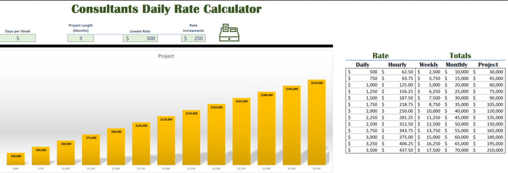 When you are bidding a project that asks for your daily rate, it is good to know what your hourly rate is as well. We have also made it easy to see how much revenue you will have over each month and the life of the project quickly.